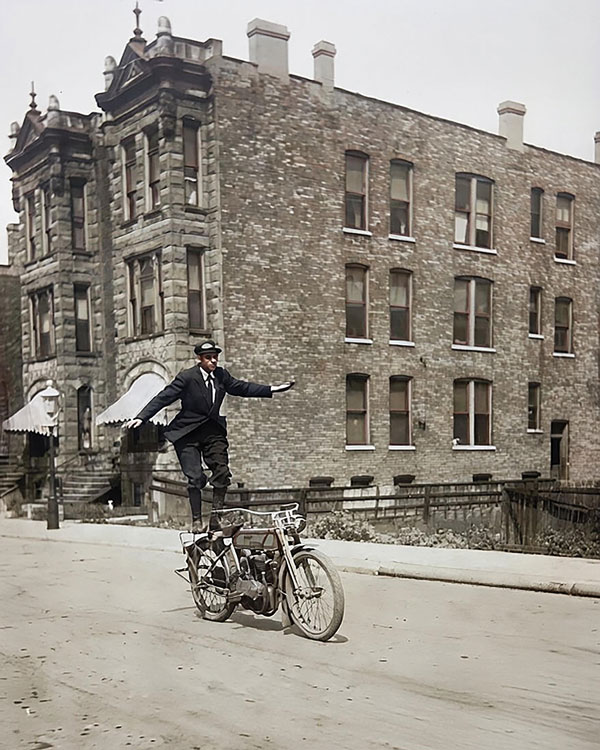 Great photo! The motorcycle has chain drive, yet retains pedals, which makes me say this is a 1912 or 1913 Harley-Davidson V-Twin. — Ed.
