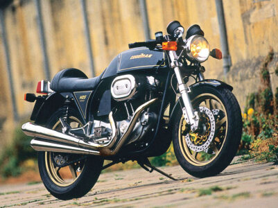 The wheels and fork were built to Goodman’s specs in Italy, and he used Magura switches and a Lucas headlight. The 18-inch wheels wore Avon Super Venoms The engines were to be provided by Harley-Davidson. Finished in a black-and-gold paint scheme, with a Connolly leather seat, the HDS 1200 had the requisite lean and hungry stance of a thoroughbred street racer.