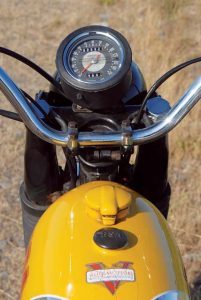 With modern ignition and the rebuilt carb, my Victor now starts easily and runs smoothly. It’s light and nimble in traffic, accelerates quickly (up to about 40mph, anyway), and the torque and rearward weight bias will easily hoist the front wheel. Fun. The brakes are excellent, and the handling is quick and secure: It’s great fun. Sadly, the stock suspension is way too firm for any serious off-highway riding, but it works fine on gravel.