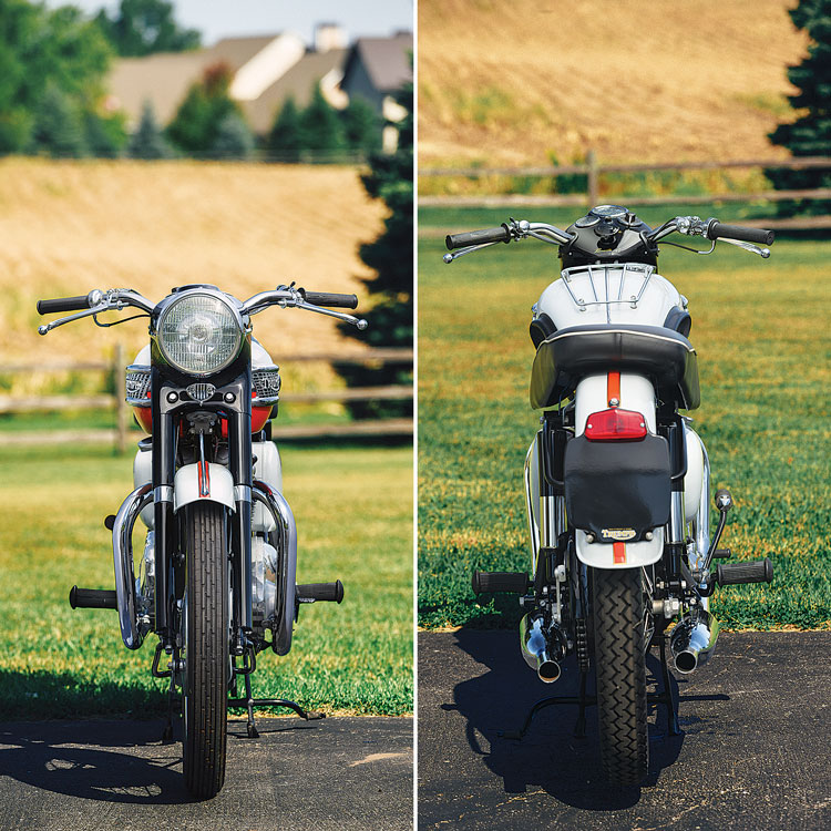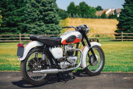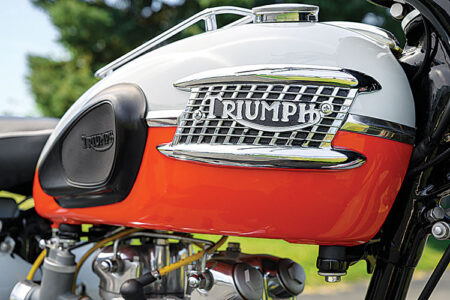 Some 1,881 Bonnevilles were made for ’59, and upon arrival in the States, few survived in the form in which they were delivered, with two-tone Tangerine and Pearl Gray tanks and deeply valanced fenders topped by a fork-mounted nacelle. Such was the case of the bike discovered by Marty Tellalian of Forest Park, Illinois. Now seen here as a well-restored example of a rare and desirable 1959 T120 Bonneville, his project bike started with only the bare bones.