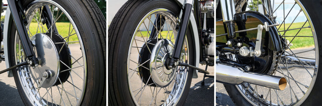 The chassis didn’t pose any problem, and anything that is black, such as the frame, stands, hubs, and other bracketry, were powder coated black. Dale cleaned up the fasteners and other hardware, including wheel axles, brake operating arms and cams, and had them all correctly cadmium plated. For the wheels, 19-inch front and rear, new chrome rims were laced to the hubs with stainless-steel spokes. From the factory, spokes were cadmium plated, but Dale says, “Those always rusted up in a year or two, and no one complains about the stainless-steel spokes.”