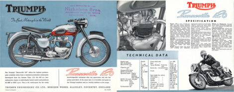 With that almost incessant pushing, Turner finally acquiesced late in 1958 with a factory-built dual-carburetor model. For a name, he turned to the American success on the salt flats, christening the motorcycle the T120 Bonneville. Announced late in the season, the new Bonneville was not included in any of Triumph’s brochures for 1959. Instead, a double-sided 7-inch by 9-inch leaflet was the only printed material the company released heralding the Bonneville’s arrival.