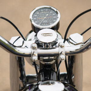 Some pieces on the current Thunderbird are not the same as first built. For example, the front hub has been replaced with a one-year-only 1954 Triumph T100 and T110 “pie crust” hub, named for the shape of its distinctive scalloped brake drum edge. Also different is the ribbed primary cover; this was originally a chrome cover. Max was offered the chrome cover as part of the deal but says it was in rough shape, so he left it behind.