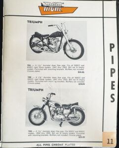 As popular as some of these aftermarket parts for older American and British motorcycles have become, information on the history of companies such as MCM is surprisingly scarce. There doesn’t appear to be a definitive online resource regarding MCM, but a friend was able to supply photos of period brochures. From these, we know that, circa 1951, the company was known as Motor-Cycle-Mufflers, or M.C.M. Mfg. Co. for short. Their business was based in Los Angeles, and products included exhaust headers and mufflers for 1951 and 1952 Triumph 5T (Speed Twin) and 6T (Thunderbird), and off-road Scrambles pipes for A.J.S., Matchless, and Velocette MAC. Also shown are headers and mufflers for a BSA A10, Indian parallel-twin, and Chief and Scout models. In another catalog, circa 1971, MCM is now in Whittier, California, and their products include pipes, mufflers, handlebars, and miscellaneous items from battery covers to fenders, fork covers, headlight brackets, mufflers, and muffler tips.