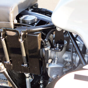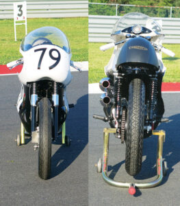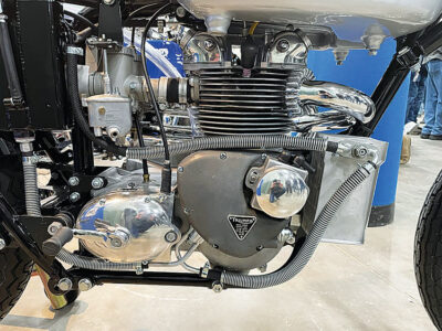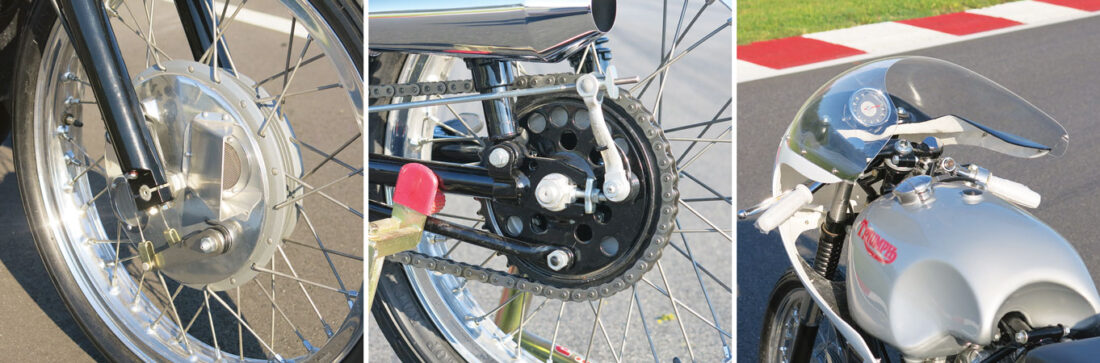 Florida-based Triumph zealot Jaye Strait provided the “rare as hen’s teeth” Lucas ET coils. Hard to find herringbone-rubber oil lines and Amal GP2 carb bits came from John Healy at Coventry Spares, while an NOS pair of GP2 slides were unearthed in the U.K. — for $500 each. Racing frame specialist Mike Owens at J&M Racing Products in Maryland reworked the extended swingarm to original spec and added front fairing mounts that had been cut off. He also fabbed up a pair of clip-on handlebars. Mike Morris in New Jersey turned out a set of curvaceous 1½-inch header pipes as used on TriCor and factory T100Rs.