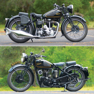 For many years, the Velocette slogan was “Always in the picture.” The official name of the British factory that built Velocettes was Veloce, Ltd. Veloce, Ltd. was a small family-owned company, but it was responsible for many motorcycling innovations, some revolutionary. Velocette produced the first sequential foot-shift gearbox, the first automatic ignition advance on an English motorcycle, and the first dual seat. The post-War Velocette frame with swingarm rear suspension and dual hydraulic suspension units was one of the first swingarm frames in commercial production. A constant threat at the Isle of Man TT races, a Velocette won its class in 1926, 1937, 1938, 1939 and 1947.