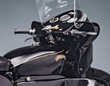A fully enclosed Vincent sport touring motorcycle such as this 1955 Black Prince was a harbinger of the future. So much so, that when the BBC produced a 1950s film adaptation of George Orwell’s dystopian and rather prescient novel 1984, they chose to mount the Thought Police on a phalanx of the ominous-looking Vincents.