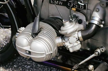Nikasil cylinders and pistons from a mid-1980s 980cc BMW R100 give a significant boost in capacity. Compression ratio is stock for reliability, and the original 750cc heads are retained, but with new, hardened valve seats to handle unleaded gas. A high-performance camshaft holds the stock valves open a little longer to allow more fuel and air in and the burned gases out, fed by two 32mm Bing carburetors. These particular carbs were chosen to create more low-speed swirl and to further boost the bike’s mid-range torque.
