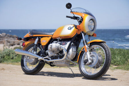 In 1976, the R90S came in two colors: candy orange fading into silver if you wanted to announce your presence to the world, or the original black fading into silver if quiet elegance was your thing. Tape pinstripes gave way to better painted pinstripes. After numerous complaints about the disc brakes not working in the wet, there were new drilled rotors. A new seat sparked happy prose from testers. The gearbox had lost its clunk, new carburetors added to the smoothness of the ride, the starter motor was stronger and a kickstarter was only available as an option. Changes to the clutch turned the previous forearm builder into a two-finger pull. The 1976 version had a stiffer front end.