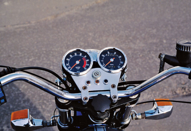 The later seat is slightly thinner (and was in fact available on some late production 1975 860s), and reduces the GT’s excessive seat height just slightly. Still, the bike feels tall when I climb aboard. Settling in, I quickly become conscious not just of the pulled-back bars but also the forward-set footrests. The right footpeg makes itself felt almost immediately, because as this early 860GT has no electric starter (electric start versions weren’t produced until January 1975) I’m forced to kickstart it — and the footrest is perfectly placed to come into contact with a kickstarting leg’s shin — ouch!