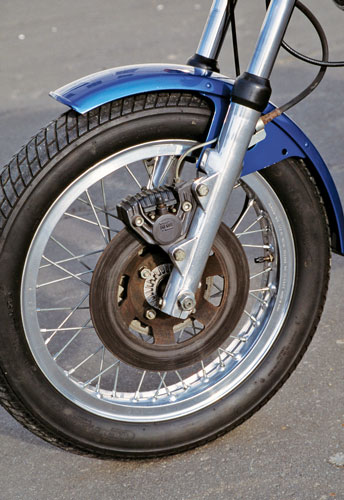 Beneath its bold blue bodywork, the Ducati’s chassis is a typical Bolognese blend of tubular steel frame and firm, Italian-made forks and shocks, supplied by Ceriani and Marzocchi, respectively. This well-preserved example is in good condition, especially considering Ducati’s reputation for poor finish. It is standard apart from its separate instruments (1975 instruments were housed in a common dash) and seat, which are from the following year’s Ducati 860 GTS.
