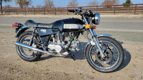 The 750s were gone and Taglioni came out with the 860 GT — with very little effort as he used two cylinders similar to those of the 450, amounting to 864cc. This bike was “built to go fast and that will do so without a lot of fiddling,” according to Cycle World, July 1975. The engine bore was 86mm and stroke 74.4mm with a single cam in each head operated by bevel gears. A wet-sump oiling system kept the engine and transmission happy, air and fins kept the motor cool. A pair of 32mm Dell’Ortos fed the cylinders with a 9.5:1 compression ratio. Ignition was transistorized. Maximum horsepower was in the high 50s at 7,000rpm. Fuel from the 4.8-gallon tank was consumed at a rate of high-30mpg with enthusiastic throttle use, to mid-40s when touring.