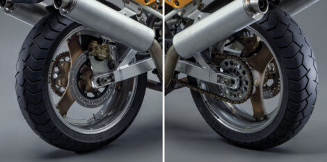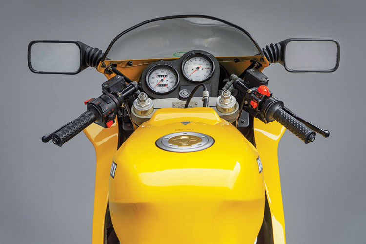 Falloon reports that Mk 2 models replaced the Mk 1s’ Marvic wheels and cast-iron brake rotors with bronze-painted cast-aluminum wheels and Brembo stainless-steel brake rotors. The Mk 1s’ vented carbon-fiber clutch cover was also swapped out for a standard non-vented SS aluminum piece. Cast-iron brake rotors reappeared on 1994 Mk 3 models, along with a few other upgrades.