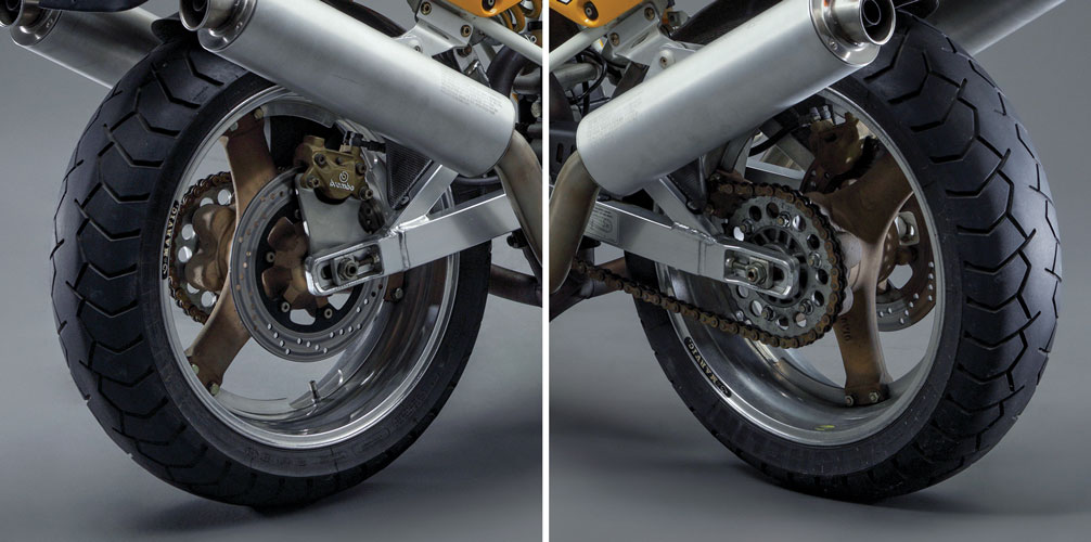 Early Europe-only Mk 1 examples were fitted with cast-iron brake rotors. All were in classic Ducati blood Red. Mk 2 versions arrived in ’92 with stainless Brembo Goldline rotors and the optional Giallo livery. But aside from the flashbike paint, carbon-fiber jewelry, and a numbered plaque on the top triple clamp, was the $9,800 Superlight worth $1,300 more than a plain-Jane Supersport?