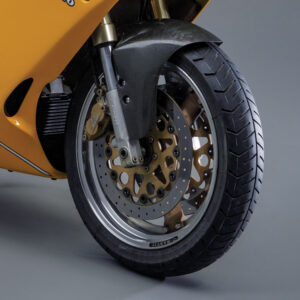 “Essentially a 900 Supersport” was Cycle World‘s take on the ’93 Superlight. The subject bike, in head-turning Giallo, was tested in the August 1992 issue. The SL parts manifest listed a solo saddle, slightly more upswept exhaust (reportedly with larger diameter silencers taken from the 888 SP4), the aforementioned carbon-fiber fenders, and Marvic wheels as stock equipment. The latter was an innovative composite design featuring a cast-magnesium center hub made by Marvic in Italy, bolted to a flanged aluminum wheel rim made by Akront in Spain.