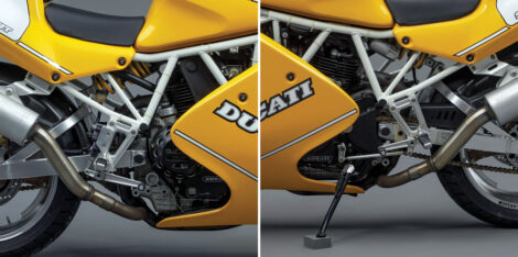 Ducati’s new-generation portfolio expanded into more sophisticated L-twins. The 1988 Desmoquattro 851 brought twin-cam four-valve heads, liquid cooling and electronic fuel injection, along with multiple World Superbike championships. Meanwhile, reviving forebear’s names, the 750 Sport debuted, followed by the 900 Supersport. The latter was probably the bike Dr. T had in mind when he laid out the Pantah a decade earlier. An air-and-oil-cooled 904cc 90-degree L-twin, with two Desmo-actuated valves atop each 92mm cylinder, the “Desmodue” shared the 851’s six-speed crankcases. The engine’s cams and valve gear were carried over from the factory Cagiva/Ducati Elefant Dakar rally engines. Its cylinder bore of 92mm, the stroke of 68mm, and 9.2:1 compression ratio had proven practical on the 902 Paso.