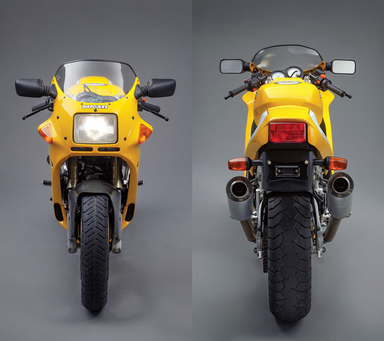 All were assembled by Ducati into gleaming new motorcycles, most of them painted in properly Italian blood red. The resulting machines were impressive. At 414 pounds dry, the 1991 900SS was 15 pounds lighter than a Honda CBR600F2. Magazine testers rated the steering to be delightfully neutral. Changing lines mid-corner was easy, and the Duck offered a feeling of security. Cornering clearance was abundant, they reported. And while it could not match period Japanese four-cylinder sport bikes at the dragstrip and in peak velocity, the Supersport was widely praised for its deep mid-range grunt, overall rideability, and, of course, the basso profundo exhaust note.