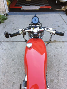 With the Powerdynamo ignition and Wassell carb, the engine will start on the first or second kick, if I’m careful with the throttle. Warm up is slow — typical for these Ducati singles. Once warm the engine will happily rev to 9,000rpm (and above) although these days I rarely exceed 7,000rpm. The engine pulls strongly from idle with no flat spots or “megaphonitis.” The Camp silencer is on the loud side, but so far I haven’t been stopped. The bike is not a garage queen and I try to ride it once a week when the weather permits here in Michigan.