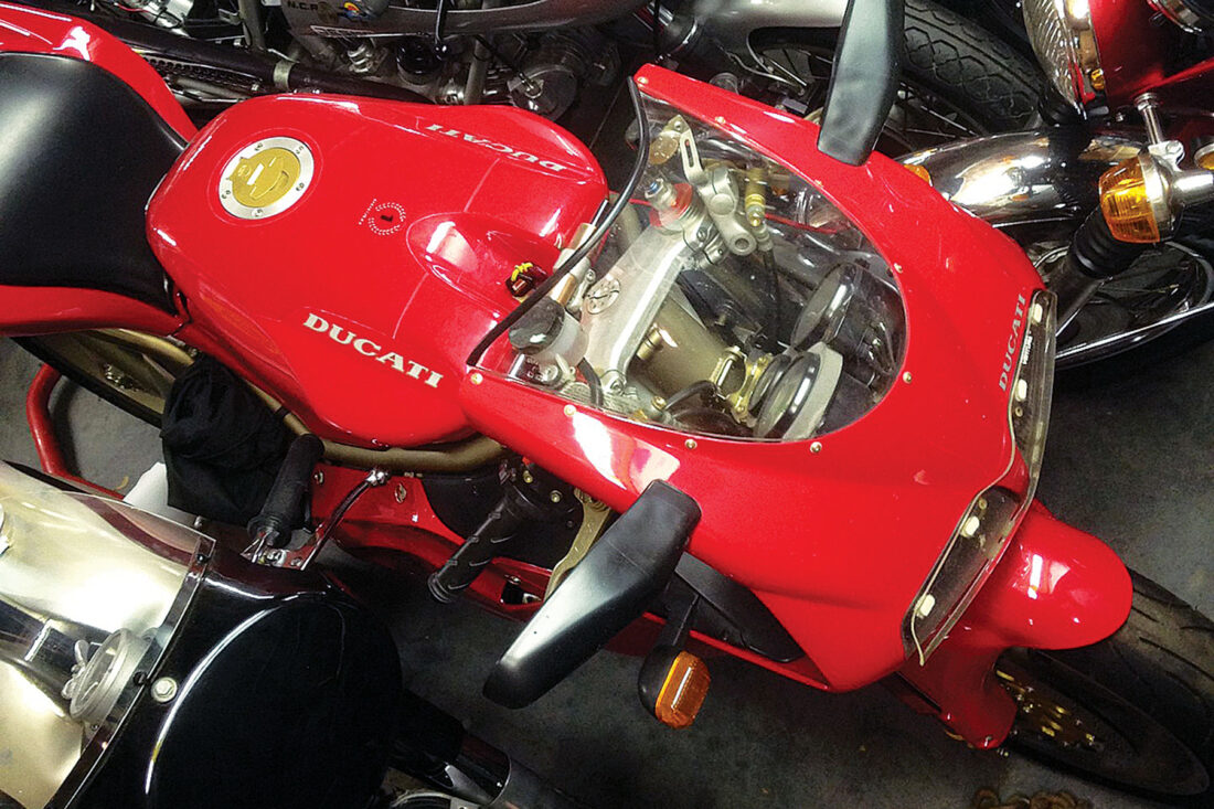 But what was the root of the grip these machines had on me — the Duc driving me to proudly hang a Turn One “Gotta Have One” T-shirt in my garage to focus on raising the money, and eventually to cash in a life insurance policy and sell seven “collector” bikes? Having studied industrial design in school, I found the 916 particularly captivating visually — so much so that it drew me past my long-held belief that Italian bikes were not only unreliable, but also expensive and difficult to find parts for. But what I thought was common sense was completely run over by a machine that seemed to rethink motorcycle engineering, design, and styling. Without the guidance of motorcycle magazines, I could see the single-sided swingarm, the understated three-spoke wheels, the dual high-level exhaust, the dual headlights in a cast aluminum housing, all complemented by an Ã-hlins rear shock and a seating position that has you wrapped into the machine. Service? Yes, belt drive Desmos are service-intensive. But I found that, through the use of Dzus fasteners, all of the well-designed bodywork and fuel tank could be stripped off in under five minutes with a bit of practice. (30 years of development later, this convenience is lost on Ducati’s newest V4S Panigale Superbike; three hours’ labor is a dealer’s charge to remove and replace the stylish yet complex, non-intuitive fairing.)
