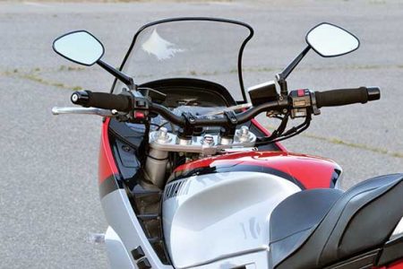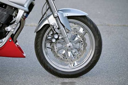 Tires: Michelin Pilot Road 3 120/70 x 17in front (120/80 x 16in stock), 180/55 x 17in rear (150/80 x 16in stock)