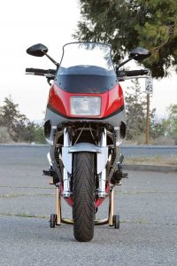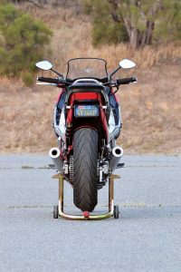 Before finishing the project with its ’80s-era paint scheme, Pat added a few other components. You’ll find relays for the headlight and Dyna coils to allow full voltage, Rizoma turn signals and mirrors, and the Corbin seat in the mix. There’s also a spin-on oil filter conversion by RPM to make oil changes a snap, and RPM’s 12-row oil cooler keeps the 15w50 Golden Spectro Synthetic blend cool during hot summer rides (Pat lives in Palm Desert, California). “The bike runs wonderfully,” Pat says proudly. “The added torque is most noticeable as is the sure-footed, supple suspension.” At 520 pounds the FJ1400 isn’t exactly a lightweight, but, as Pat tells us, “She’s a big girl by today’s standards, but she sure can dance.” And as a survivor of the mid-’80s sport bike era, Pat can’t remember when he’s experienced a better ride. MC
