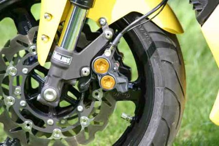 The front wheel was another R1-sourced item, and it was treated to a set of wave rotors. The stock four-piston calipers were retained, but with the addition of some race-compound SBS pads. Up at the custom bars, the stock R1 master cylinder was used, with the fluid traveling through braided-steel lines after being activated by a fully adjustable, folding brake lever from GP Tech. The rear wheel came from an R6, and a wave rotor and stock caliper supply the needed braking power.