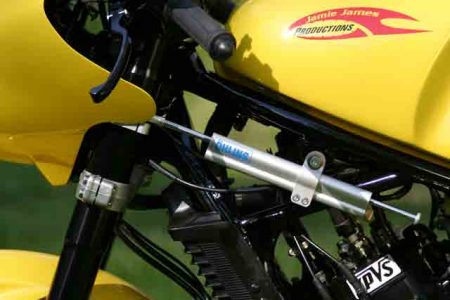 First the bike was stripped to the bare frame and any unnecessary brackets and lugs were removed. Then the frame was widened to take a modern box-section swing arm, and deep-black gloss paint was applied. A Yamaha R7 Ohlins shock found its way onto the rear end, and a set of R1 forks were grafted on up front. These were treated to Ohlins internals for improved performance and bolted into a stock R1 lower clamp with a custom Jamie James Productions (JJP) upper triple clamp up top.