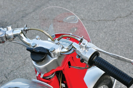 Perhaps the CB92’s most distinguishing feature was its fuel tank, constructed of alloy on early models before Honda switched to sheet metal that was easier and less expensive to form into shape. Regardless of composition, the CB92’s metallic silver gas tank clearly resembled the RC142’s hand-formed alloy fuel cell used at the 1959 TT. Rightly so, the CB92’s tank appeared to be sized and sculpted for a specific purpose — high-performance riding. The low-profile seat butted up to the gas tank, and an optional solo saddle sporting a kick-up tail section resembling Honda’s Grand Prix race bikes’ seats. And above all else, that accessory solo seat suggested one thing — racing.