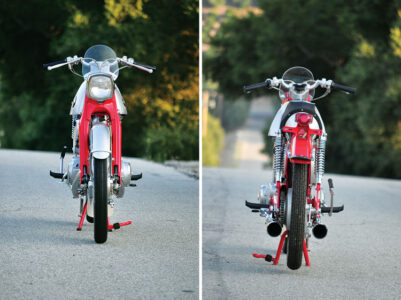 Throughout their years in the lineup, both the CB92/CA95 utilized pressed-steel frames with leading-link front forks similar to those on the 1959 IoM racers (although the racers’ fork legs included sturdier round tubing, etc.). Rear suspension featured twin shock absorbers, but again the bikes differed from each other; all “standard” Benlys were equipped with Honda’s ubiquitous enclosed tube shock absorbers found on most Hondas of the time, while the CB92 relied on a pair of exposed coil-over-spring rear shocks, much like those on Grand Prix racers, to smooth the ride.