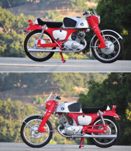 It’s safe to say, too, that the mushroom-shape cloud from that sales explosion included the model featured here, perhaps Honda’s first sport bike, powered by a 124.6cc engine boasting bore and stroke of 44mm x 41mm, the same specs found with Honda’s expeditionary force of RC142 bikes that helped fill the 1959 TT grid. The CB92 Benly, featured here, was among the initial street models to evolve from team racing. But in truth, it derived from a more conventional, and somewhat subdued, street model, too — the CA90, powered by a 125cc engine with 44mm x 41mm bore and stroke. The short-lived CA90 was kick-start only, and by 1959 the electric-start CA92 Benly replaced it in America, with similar variations intended for worldwide use. But by 1960, the CA95, powered by a 154cc variant of original CA90’s twin-cylinder 125cc street engine, joined the U.S. market, supplanting the CA92. The folks at American Honda’s new facility in Los Angeles, California, realized soon enough that an electric starter was a convenience that Americans would love. So was more power, prompting the addition of the CA95 and its larger engine to the lineup. However, the C92 continued to be sold in most other international markets.