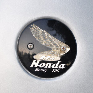 A final feature about the CB92’s gas tank: As per Honda’s practice during those days, early CB92 tanks (1959) wore rubber pad and decals on their sides. By 1960, Honda’s familiar round plastic emblems marked “Benly” replaced the decals. From 1961 on, CB92 tanks were marked “Benly 125,” and also were used on the special CR93 (125cc) full-race model.