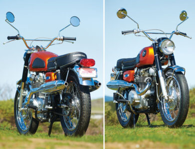 Second, the engineers designed a kit to improve the visual desirability of the CB450K0 and get all those unsold four-speed units out of warehouses before the K1 hit showroom floors. At the time, scramblers (basically on-road bikes with off-road capability) were very popular, and Honda thought that a 450 in scrambler guise would clear out the dealerships at a faster clip. These kits were first advertised in the late summer of 1967. The kits included chrome fenders, a smaller and more shapely tank, cross-braced handlebars, a different seat with gold welting, footpegs, upswept dual mufflers and associated hardware, a longer kickstarter and side covers with the Super Sport checkered field. The replacement tanks and side covers included in these kits were described as candy red (actually “Candytone Orange,” as seen on Clay Baker’s bike and the example in the Honda Collection Hall in Japan), candy blue and metallic silver.
