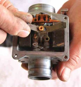 The new float bowl gaskets in our rebuild kits were just O-rings and weren’t formed, making it hard to set them in place on the float bowl. To make things easier, fill the groove in the float bowl with white lithium grease, press the gasket in, wipe off excess grease and install the float bowl with its four screws.
