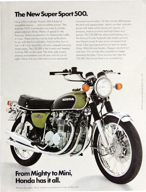 “The thinking man’s motorcycle.” That was Cycle magazine’s take on Honda’s half-liter four, the Honda CB500 Four. Smaller and lighter than its famous big brother, the trend-setting Honda CB750 Four, the new for 1971 Honda CB500 Four took all the 750’s fine attributes and focused them into a smaller, lighter bike that in many ways was better than its much-lauded forbearer.