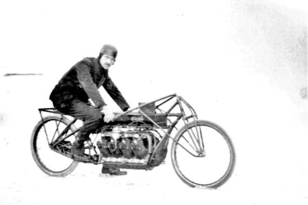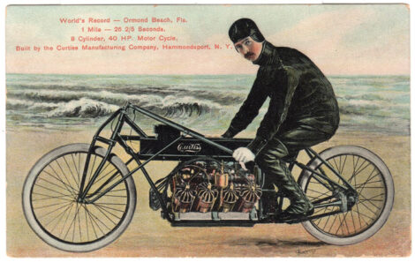 Before Glenn Curtiss was recognized as one of the world’s true aviation inventors and pioneers, his focus was on motorcycles. A contemporary of the men developing Indian and Harley-Davidson motorcycles, he brought us the V-Twin design before any of them. Knowing that top speed brought great attention from the public, ultimately, he put his then-most-developed air-cooled aviation engine into a specially fabricated chassis and set out to be not only the fastest man on a motorcycle, but the fastest man on earth. Noted Curtiss historian and writer Richard Leisenring tells the story in chapter nine of his book Curtiss Motorcycles 1902-1912.