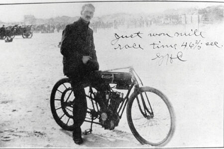 Glenn’s personal comments on the record-breaking V-8 run were a bit subdued due to his typically modest nature. In a magazine interview, he was quoted as saying, “Riding an eight-cylinder motor cycle is not likely to become very popular,” and at such a high speed, “all I could see was a streak of beach with wild surf on one side, sand hills on the other, and a black spot where the crowd was. The machine set up a terrific and inexplicable vibration; it was so great that it did not create wholly comforting thoughts.” However, he did say of the experience: “It satisfied my speed craving.”