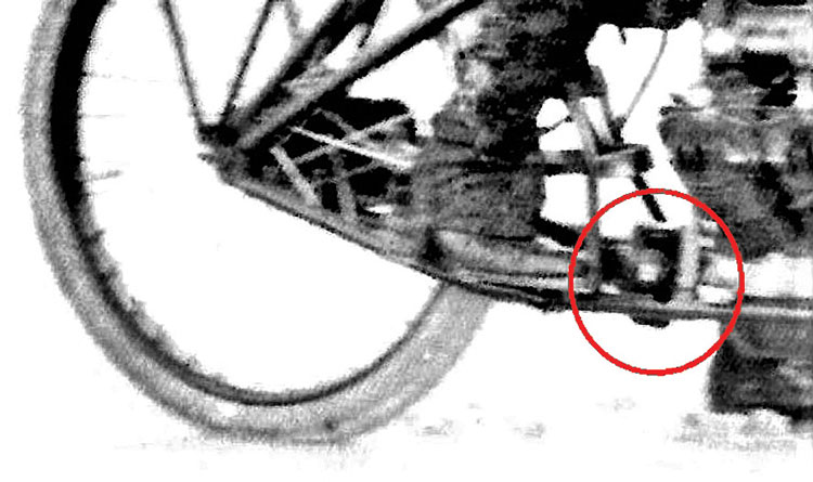 It has always been suggested that the cycle was direct drive without a clutch. If so, the rear wheel could have been elevated, either with a portable stand or by two men lifting the back end off the ground in order for the wheel to spin freely when the engine started. The combination stand / luggage rack — which can be seen on the back of the cycle in the beach run photographs taken during the event — was an item that Glenn offered in his retail catalog, and may possibly have been used as intended. However, contemporaneous photographs from 1907, right up to 1990 photos, also show a large, round object just behind the engine and bolted to the frame. This may actually have been a gearbox or a centrifugal clutch, similar to those introduced in 1889 for use on early Daimler automobiles.