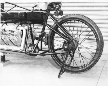 Henry Kleckler (a new employee and later a major asset for the company in engine design) was put in charge of the night shift crew building the cycle and was given the task of creating and installing the beveled gears and universal joint for its driveshaft. He was also responsible for overseeing Charlie Wixom, the company carpenter, in the shipping department and with getting the cycle ready for shipment to the speed trials at Ormond Beach (Glenn’s second and last visit), being held the fourth week in January. The finished cycle was huge — slightly over eight feet long and heavy, weighing around 280 pounds. It was equipped with an automobile tire in the rear and a cycle tire on the front.