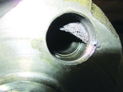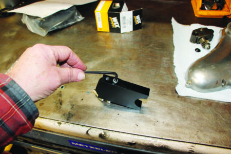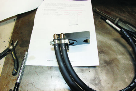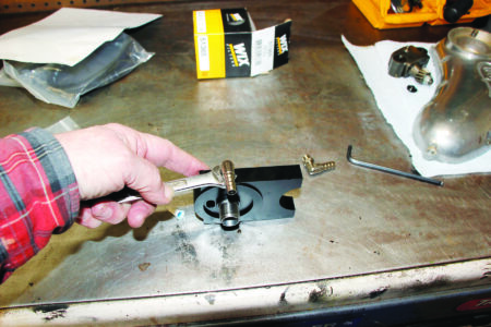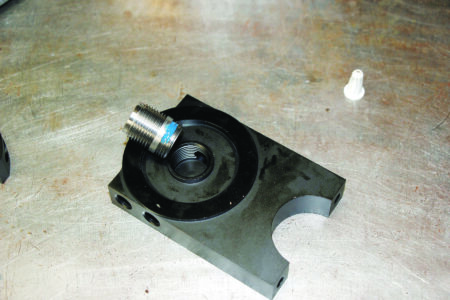 6 You can attach the hose adapters to either side of the filter mount, depending on where you choose to place it. For our purposes, we’re putting the hoses on the side closest to the oil tank. Use the supplied pipe plugs to seal off the unused ports, again with a little Loctite.