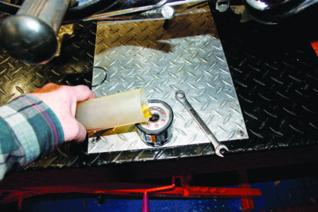 13. Before installing the filter, prefill it with oil. You should do this a few times, waiting for the oil to soak in and displace the air in the filter until the filter stops bubbling. Rub a film of oil on the gasket surface for final installation.
