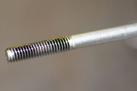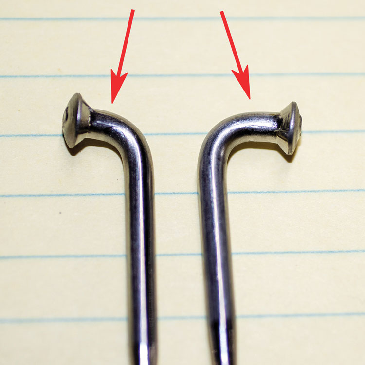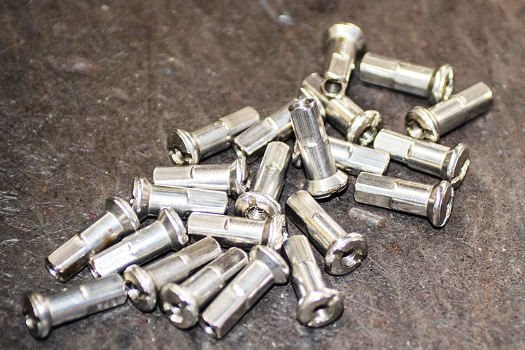 There’s a lot going on with nipples and spokes. Nipples have a slot on their underside for initial screwdriver tightening, flats on their shank for final nipple wrench tightening, and threads on their inside diameter for connecting with the spoke. Spokes on the same wheel are usually not identical. Spokes that mount inside the hub will have different throats than spokes on the outside. Left and right spoke length will be different if the rim is offset from the hub.