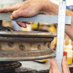Measure the lateral offset of the wheel rim edge to a reference point on the hub. This is accomplished by establishing a hub reference point (usually the flat surface near where the axle goes through the hub), placing a horizontal straightedge along the hub from that reference point to a point beyond the rim’s edge, and then vertically measuring (and recording) the distance from the straightedge to the rim’s edge. A dimensioned sketch will be helpful during assembly.