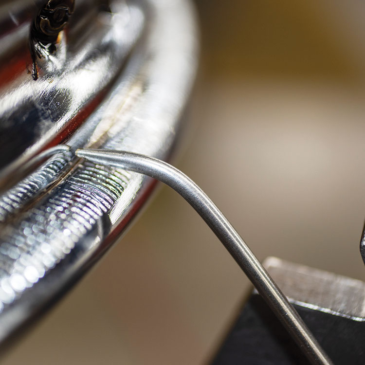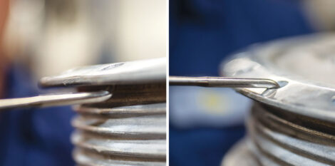 Once the above steps are completed, the wheel must be trued. What we are seeking to achieve is maintaining required rim/hub offset, and truing the wheel to not more than ±0.015 inch lateral runout (side-to-side variability around the rim circumference) and not more than ±0.015 inch diametral runout (variability in wheel diameter and wheel concentricity to the hub). Diametral variability, when met, assures the wheel is round (there are no high or low spots, or bulges), and that the rim is concentric to the hub. To achieve this, we’ll use a runout indicator positioned near the rim’s edge. We spin the wheel, compare its variability to the runout indicator, and selectively tighten spokes to true the rim. A business card is about 0.015 inch thick, so ±0.015 means the wheel’s left-to-right and concentricity variability will be less than the thickness of two business cards.