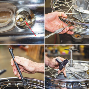 One of the first steps in lacing a wheel involves determining if the hub is correct for the wheel. Especially when working with older motorcycles, it’s not unusual for wheels to have hubs that are not original. Another initial step is to determine the offset between the hub and the rim, as hubs, particularly rear wheel hubs, are often offset to the rim to accommodate sprockets, cush drives, and disk brakes. Wheels should be laced such that they follow the motorcycle centerline, and to determine that, it’s best to use the front forks as a reference point. Front wheel rims are usually centered between the forks, but the front wheel hub may or may not be. After determining where the front wheel rim should be, the rear wheel rim’s centerline should be in line with the front, but may not have the rear wheel centered in the swingarm. Before lacing your new spokes and nipples to the hub and rim, make sure you have the correct parts. If you plan to clean, polish, plate, or paint the rim or hub, do so before attempting to lace the wheel.