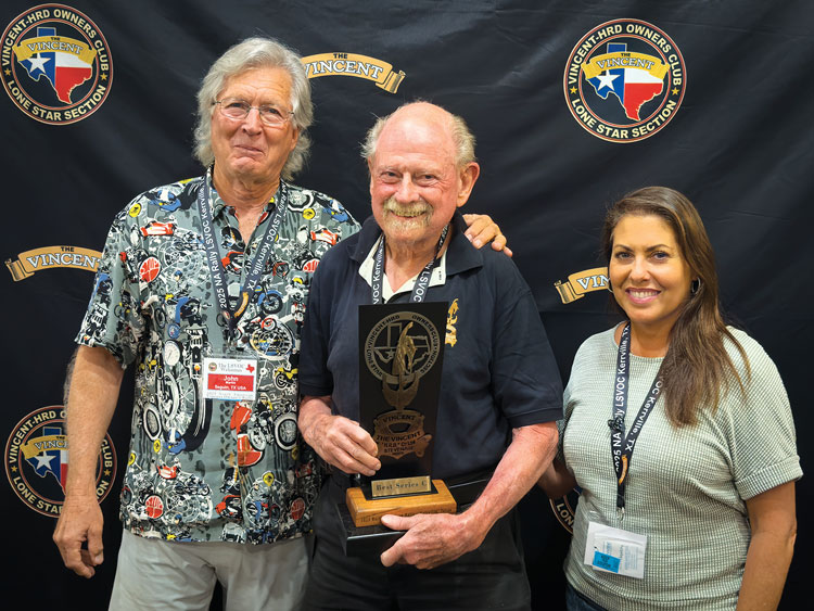 John Clark, a 90-year-old Texan, was in fine form at the rally, sharing tales of his youth as a Vincent racer in the 1950s. As a young man, he studied aeronautical engineering at University of Texas, Austin, and took a summer job in Southern California. He used to hang around legendary Vincent racer Marty Dickerson’s motorcycle shop in Hawthorne. When John returned to Austin, he bought a new, in-the-crate 1953 Series C Rapide in 1955. After building up the bike, John competed in and won road races and drag races, establishing a reputation as a fast guy and earning the nickname “The Vincent Kid.” Though he no longer rides, John’s presence brought a deep sense of continuity and tradition to the event.