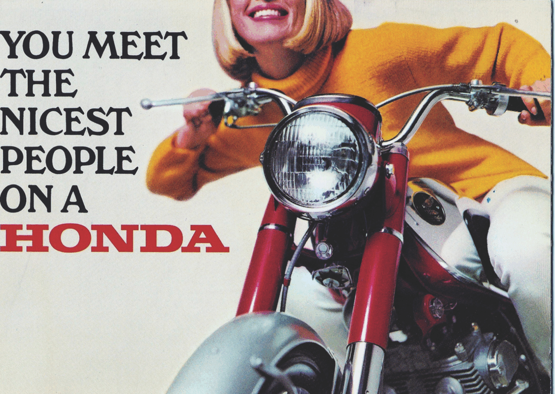 “You Meet The Nicest People On A Honda” is perhaps the most iconic motorcycle sales slogan ever created, and it certainly is among the most effective. Sales of all motorcycles imported to America in 1959 accounted for approximately 6,300 units. That same year, Honda Motor Co. founded its U.S. distributorship — American Honda — in Los Angeles. By the end of 1963, the first full year that the Nicest People ad appeared in magazines and newspapers across America, total motorcycle sales in the U.S. had soared to about 148,000 units, and, according to author Tetsuo Sakiya in his book Honda Motor (The Men the Management the Machines), those record numbers were “due primarily to Honda Motor.”