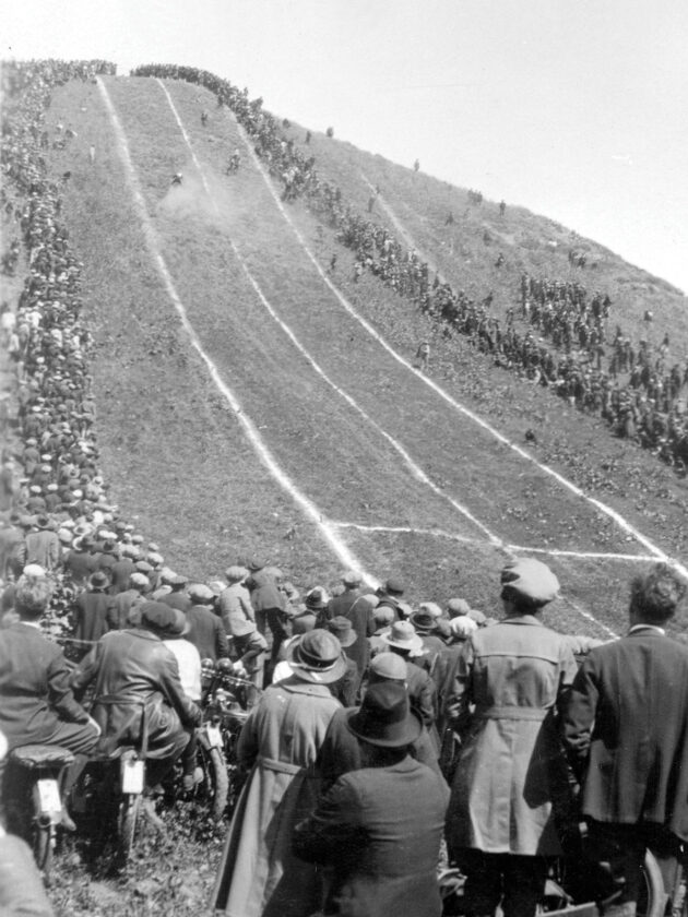 The hillclimb became a rather popular annual event, often coinciding with the “Return of the Swallows” celebration in town. Soon, Motorcycle Hill drew entries from across the nation, including National Hillclimb Champions Orie Steele and Ed Ryan. Elapsed climb times dropped below 15 seconds, and the competition included various classes according to engine displacement and modifications for improved performance.