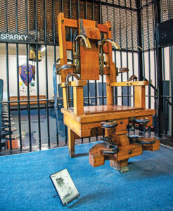 Literally across the street from the mound is another point of interest: The former West Virginia State Penitentiary. It had been used for well over 100 years when it shut down in 1996 (the West Virginia Supreme Court ruled it inhumane). There’s a 90-minute walking tour we thoroughly enjoyed. This is a place with a horrifying history (it was one of the most violent prisons in America), and our guide drew from its history to make it come alive. Things were different back then. West Virginia used to hold public executions there and charge people admission. You see the prison’s electric chair as soon as you enter the lobby, but its use came late in the prison’s history and only nine people were executed in it. Another 85 condemned prisoners went via the gallows. In one public hanging, the gallows’ trap sprang open before the executioner slipped the noose around the prisoner’s neck. He dropped 25 feet, breaking numerous bones when he hit the concrete below. Undeterred, the staff strapped him to a stretcher, hauled him back up the gallows steps, and hung him while he was still on the stretcher. “Don’t mind the pain,” they told him. “In five minutes, you won’t feel a thing.”