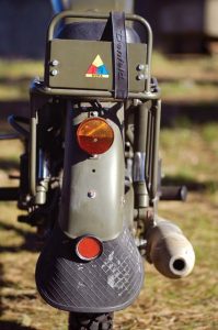 The Swiss civilized the starting ritual with a handlebar-mounted choke lever, and the low-compression single responds to a single prod on the left-side kickstart with a quiet chuffing. Opening the throttle results in only tiny increases in noise from the huge muffler — this is one of the quietest motorcycles you’ll never hear; helpful in allowing the Swiss army patrols a modicum of surprise, perhaps?